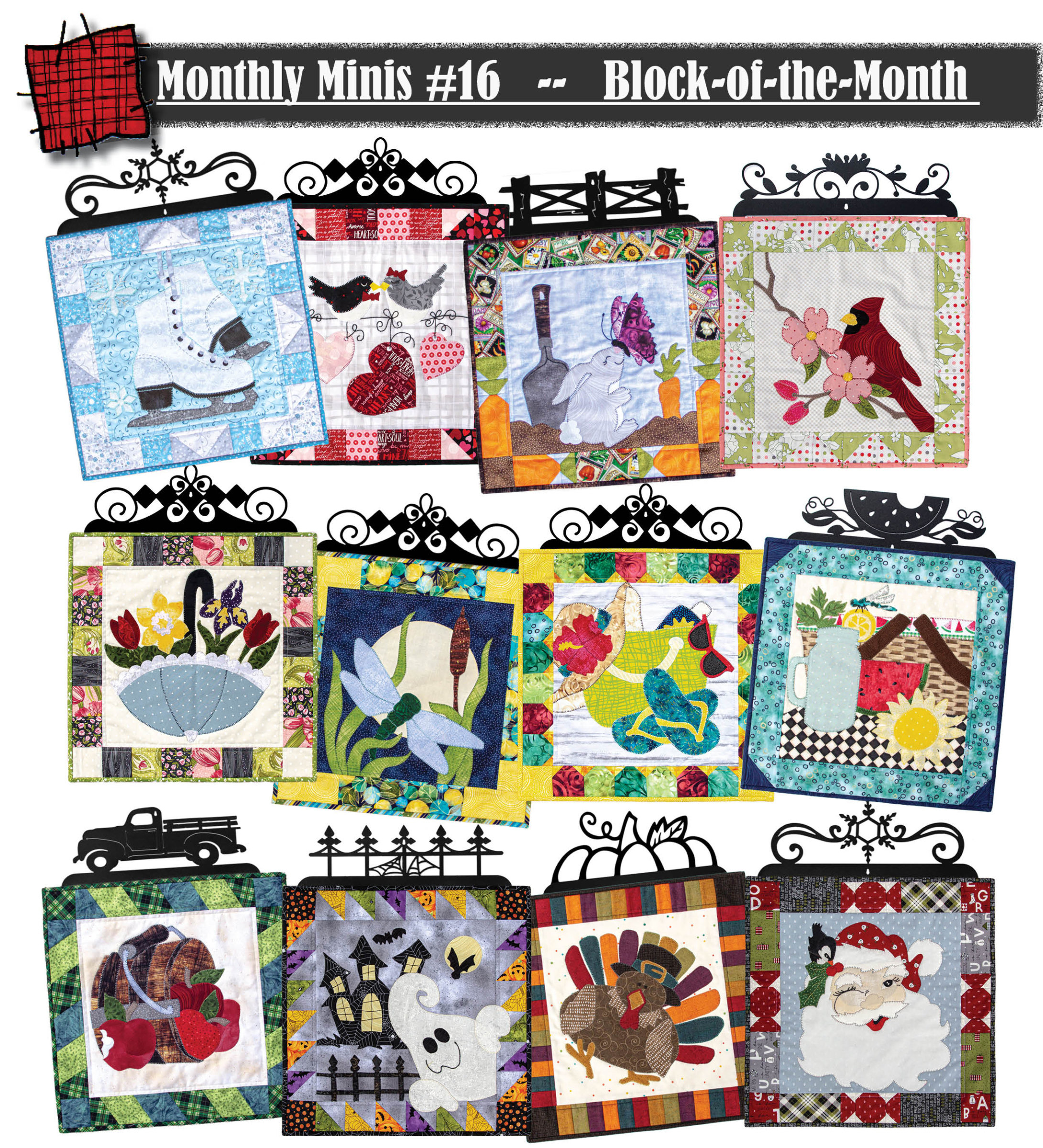 Monthly Minis are Block of the Month series. Each series contains 4 to 12 seasonal quilted applique projects of the same size.